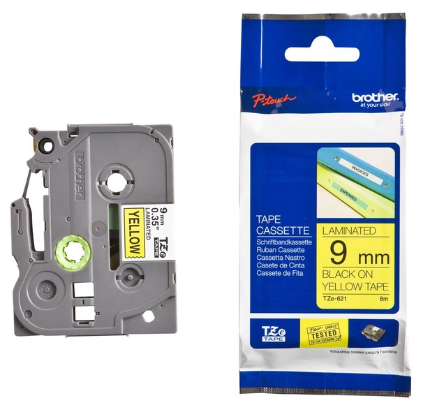 TZ-621 típusú, 9 mm széles, 8 m hosszú, sárga alapon fekete színű tartós laminált feliratokhoz nyomtatószalag.