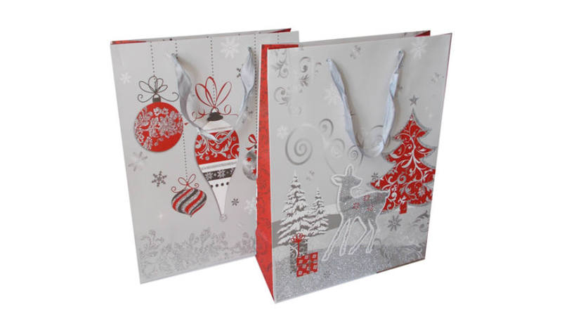 Dísztasak 32x26x12cm, papír, Karácsonyi ezüst-vörös vegyes mintával