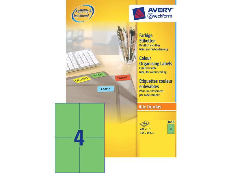 Etikett 105x148 mm, AVERY 3458 univerzális, 100 lap, zöld