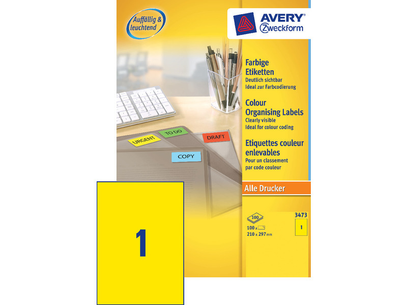 Etikett 210x297 mm, AVERY 3473 univerzális, 1 címke, 100 lap, sárga