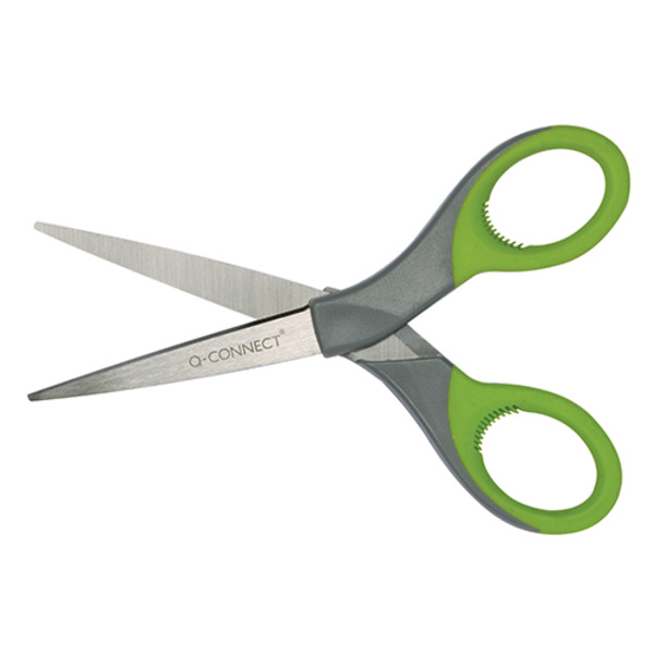 Olló 17 cm, Q-CONNECT KF03986, univerzális, gumis, szürke-zöld nyéllel.